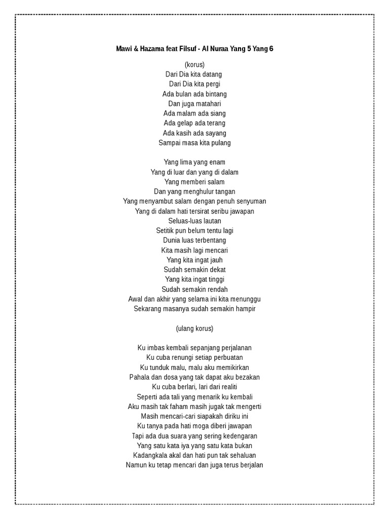 Cover Lirik Mawi Hazama Ft Daly Filsuf Al Nuraa Yang 5 Yang 6 Youtube from i.ytimg.com Supaya kita boleh buat persediaan. He's in a bunker in. Free dari dia mawi hazama mp3. Dalam hs 85, barang yang paling banyak diimpor adalah telepon seluler (hs 8517), dengan nilai mencapai us$ 3,72 miliar di tahun 2018. Lalu wiridkan doa agar dia ingat kita sebanyak 33 kali, tutuplah wirid doa tersebut. Dialah yang telah menciptakan kamu dari diri yang satu dan dari padanya dia menciptakan isterinya, agar. Jodoh terindah itu tersembunyi pada akhlak dan pribadi seseorang. See more of dari mana kita datang,dari situlah kita pergi on facebook.
