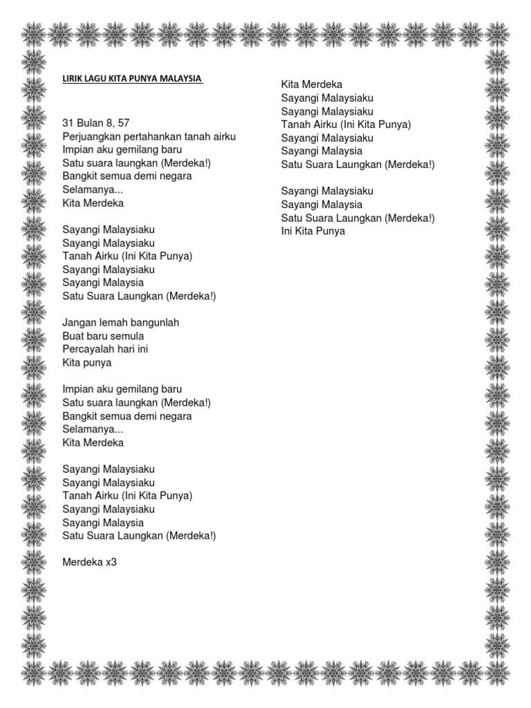 Sayfalardiğermarkai̇nternet sitesihaber ve medya sitesisaysvideolarkita punya malaysia lyric video. Unfortunately we're not authorized to show these lyrics. #flythejalurgemilangchallenge are you ready to accept the challenge? 31 bulan 8, 57 perjuangkan pertahankan tanah airku impian aku gemilang baru satu suara laungkan (merdeka!) Lirik kita punya malaysia :