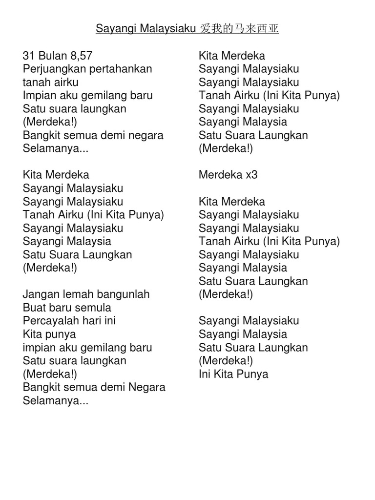 Sayangi malaysiaku sayangi malaysiaku tanah airku (ini kita punya) sayangi malaysiaku sayangi malaysia satu suara laungkan (merdeka!) jangan lemah bangunlah buat baru semula percayalah hari ini kita punya.