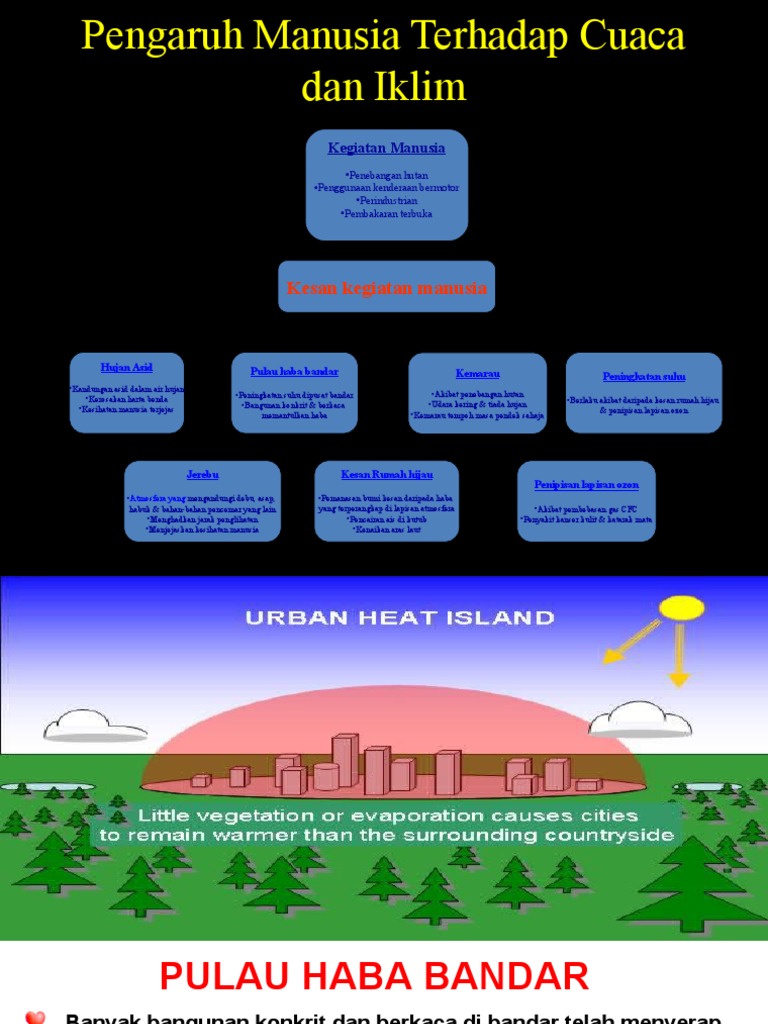 Kelip-kelipan Contest: Pulau Haba ~ Kesannya terhadap alam ... from 3.bp.blogspot.com Senin, 27 mei 2019 20:26. Pulau haba bandar atau pulau bahang bandar (urban heat island, disingkatkan kepada uhi) ialah kawasan bandar atau kawasan metropolitan yang ketara lebih panas daripada kawasan luar bandar sekitarnya disebabkan oleh aktiviti manusia. Walaupun keletihan haba tidak teruk seperti stroke haba, keadaan haba yang melampau ini bukan sesuatu yang harus diabaikan. Langkah mengurangkan fenomena pulau haba di bandar. Langkah mengatasi pencemaran tanah : Asap ini mengandungi karbon monoksida yang tinggi. Ianya bukan sahaja akan mengakibatkan. Jika tidak segera diatasi maka kerugian yang diakibatkan oleh lalat buah sangatlah fatal karena yang diserang adalah bagian buah yang biasanya menjadi tujuan akhir suatu usaha budidaya tanaman.
