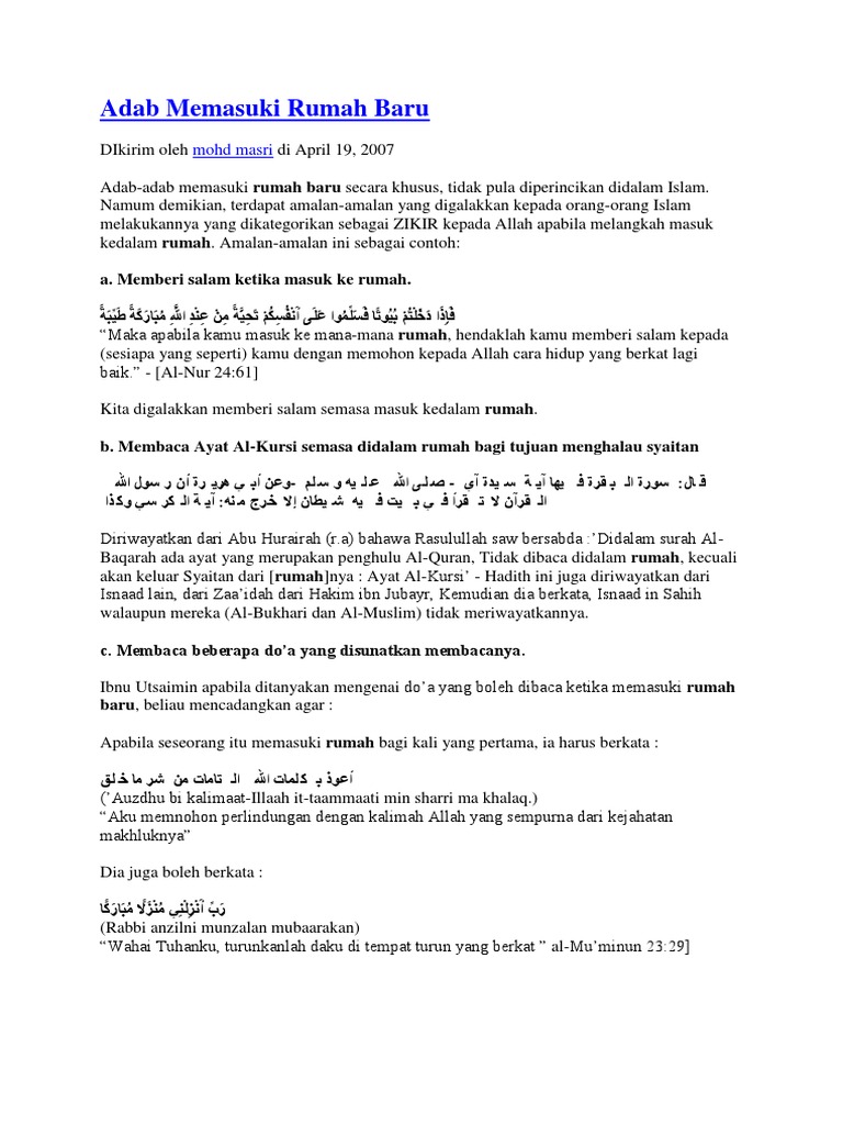 Pasal ini menunjukkan kelengkapan ajaran islam dalam mengatur semua kondisi seorang muslim. Adab dan doa masuk dan keluar rumah. Adab dan doa masuk rumah. Mengucapkan salam (kepada pemilik rumah saat bertamu). Kebiasaan membaca doa sebelum masuk ke rumah mungkin. Selawat serta salam buat junjungan mulia nabi muhammad saw keluarga serta para sahabat dan pengikut yang istiqamah. (katagori posting aneka ) pembaca budiman, jump. Mengetuk pintu dengan pelan jika masuk ke rumahnya, seorang muslim dianjurkan menggetuk pintu dengan pe lan. Hadist rasulullah yang memerintahkan umatnya agar membaca bacaan diatas ketika akan memasuki rumah baru. Ketiga, masuklah rumah baru dengan mambaca بِسْمِ اللَّهِ الرَّحْمَٰنِ الرَّحِيمِ assalamu 'alaikum wr.wb. Ketiga, mengucapkan salam ketika masuk rumah baru adalah disunatkan untuk memberi salam tak kira rumah baru atau rumah lama. 3.ketika akan memasuki rumah baru, dianjurkan membaca bacaan, yaitu: